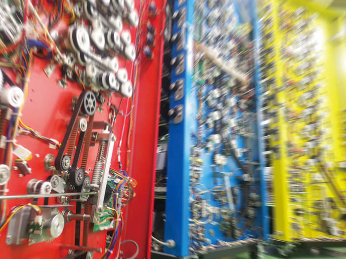 ●装置組立部門 板金部品、機械加工部品、ギア、モーター、基板、配線など、メカトロ装置の組立を行っています。自社開発製品である折込広告丁合機をはじめとした装置やプラント設備の完成機製作や、電気製品等の部品組立なども行っています。