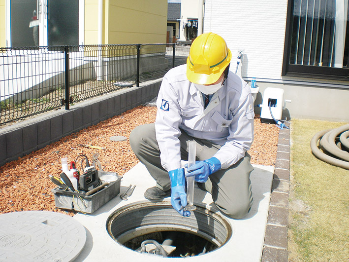 私たちが毎日出す汚れた水は、下水道から下水処理場へ流れます。しかし、下水道が通っていない地域は各家庭に「浄化槽」という生活排水をきれいにして川に流す装置を設置しなければなりません。浄化槽管理士が日々点検をし、きれいな水を河川に戻しています。