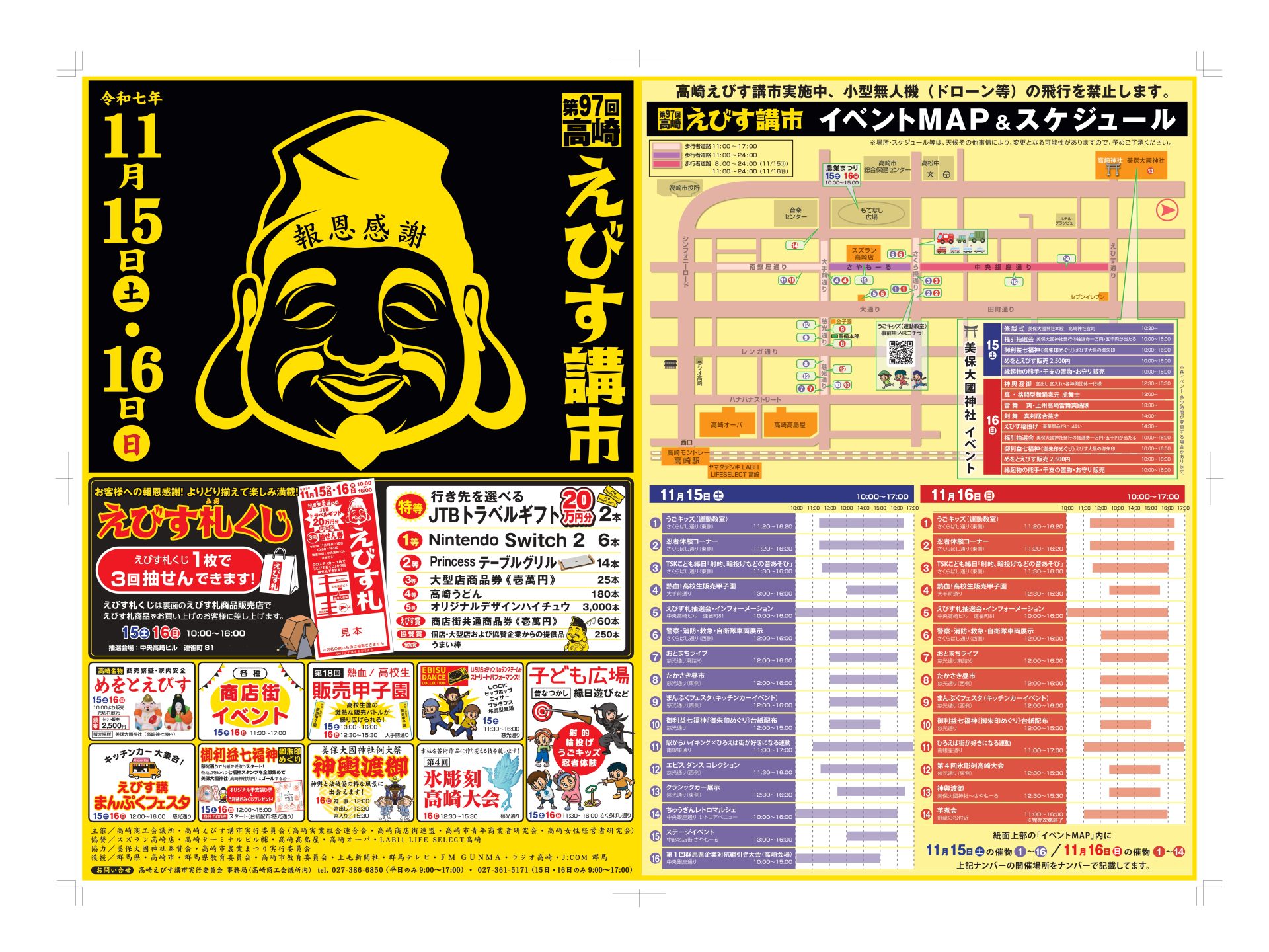 「高崎えびす講市」は、昭和4年に第1回を開催し、今年で97回目を数えるイベントです。中心商店街の小売業者がお客様への日頃のご愛顧に対し、年に一度の報恩感謝の意を表すとともに、商都高崎の商圏拡大と小売業界の振興発展を目的に開催されています。