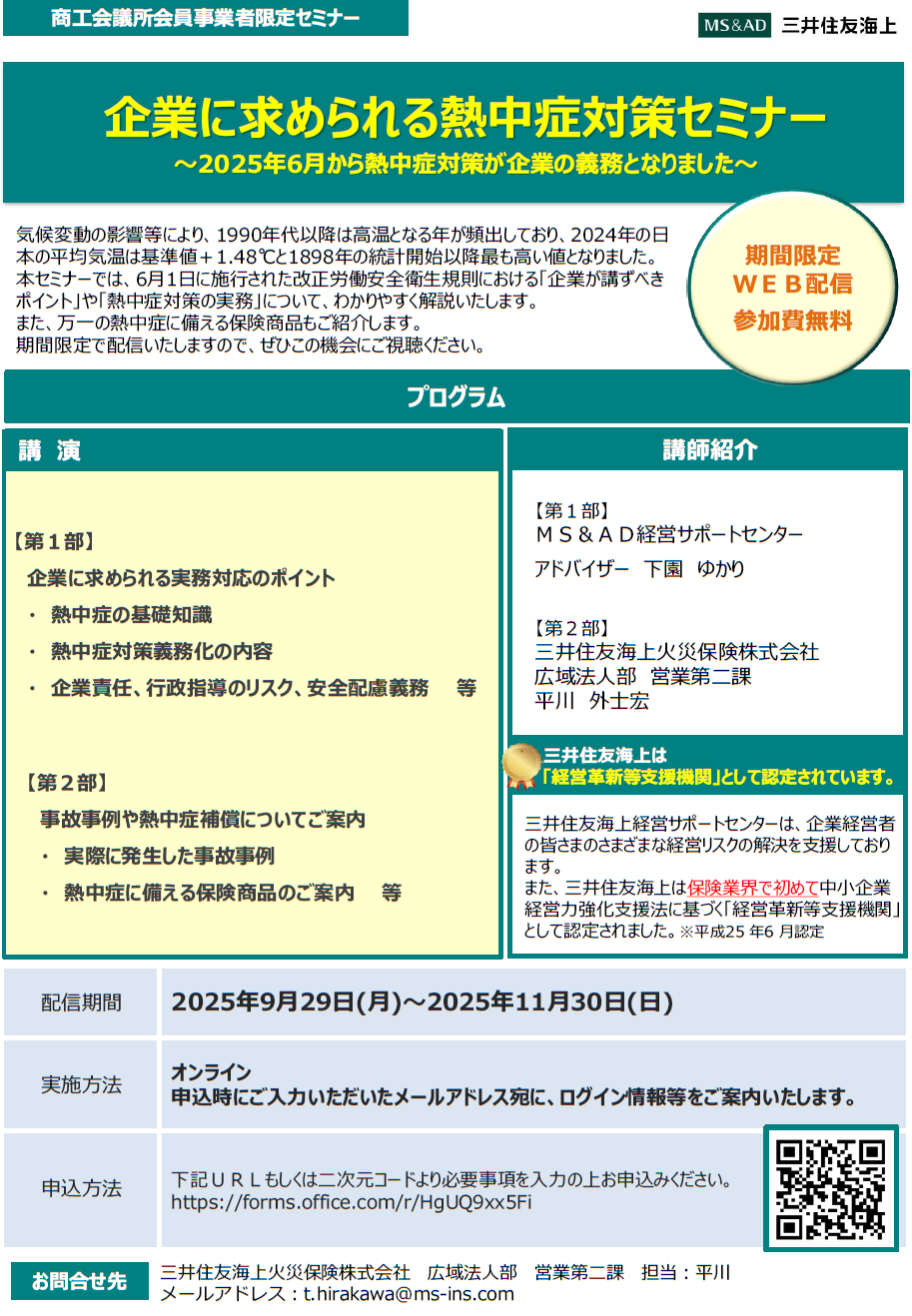三井住友海上火災保険株式会社では、商工会議所会員事業者向けに標記オンラインセミナーを開催いたします。