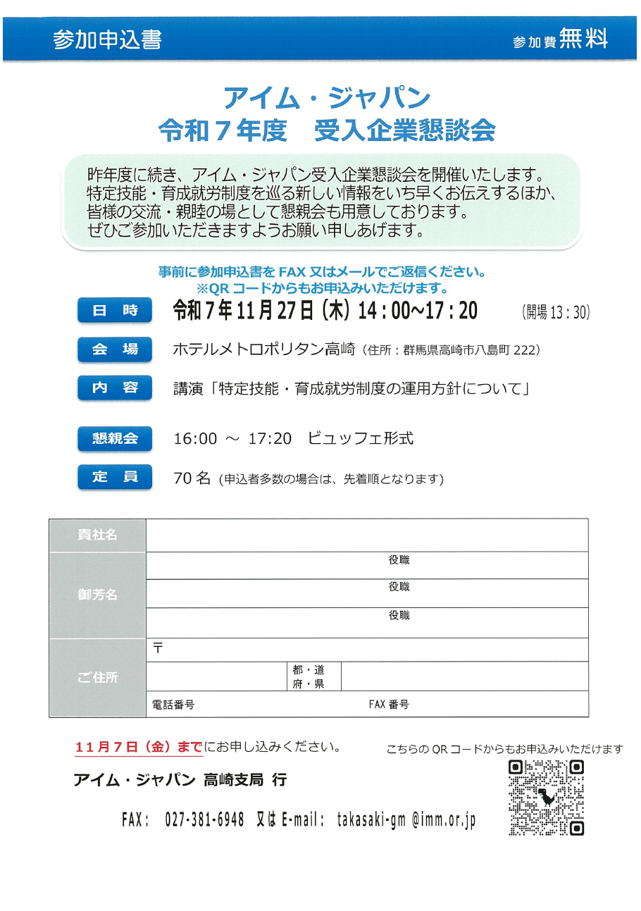 アイム・ジャパン 令和7年度受入企業懇談会のお知らせ【公益財団法人国際人材育成機構 高崎支局】