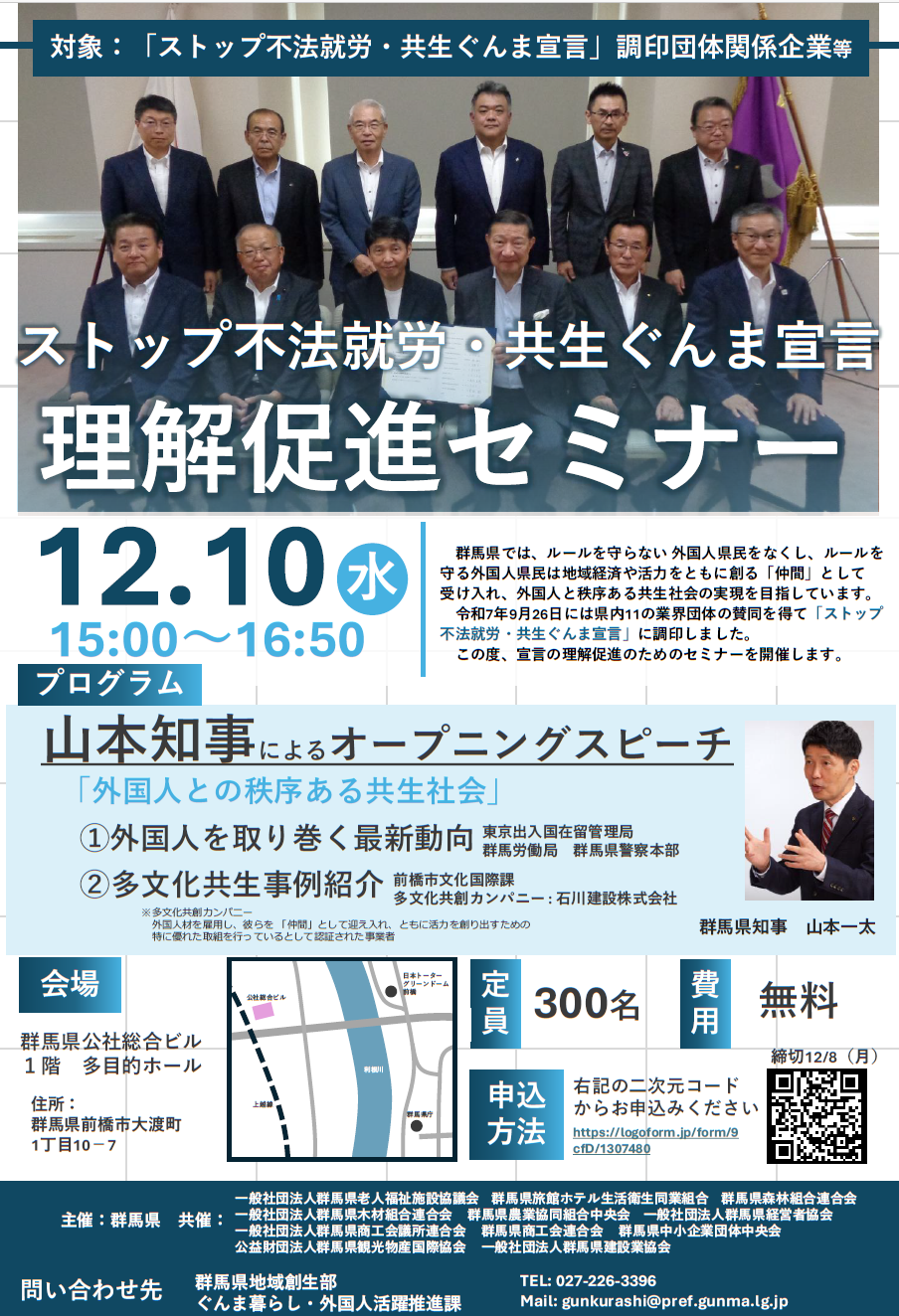 令和7年9月26日には県内11の業界団体の賛同を得て「ストップ不法就労・共生ぐんま宣言」に調印しました。