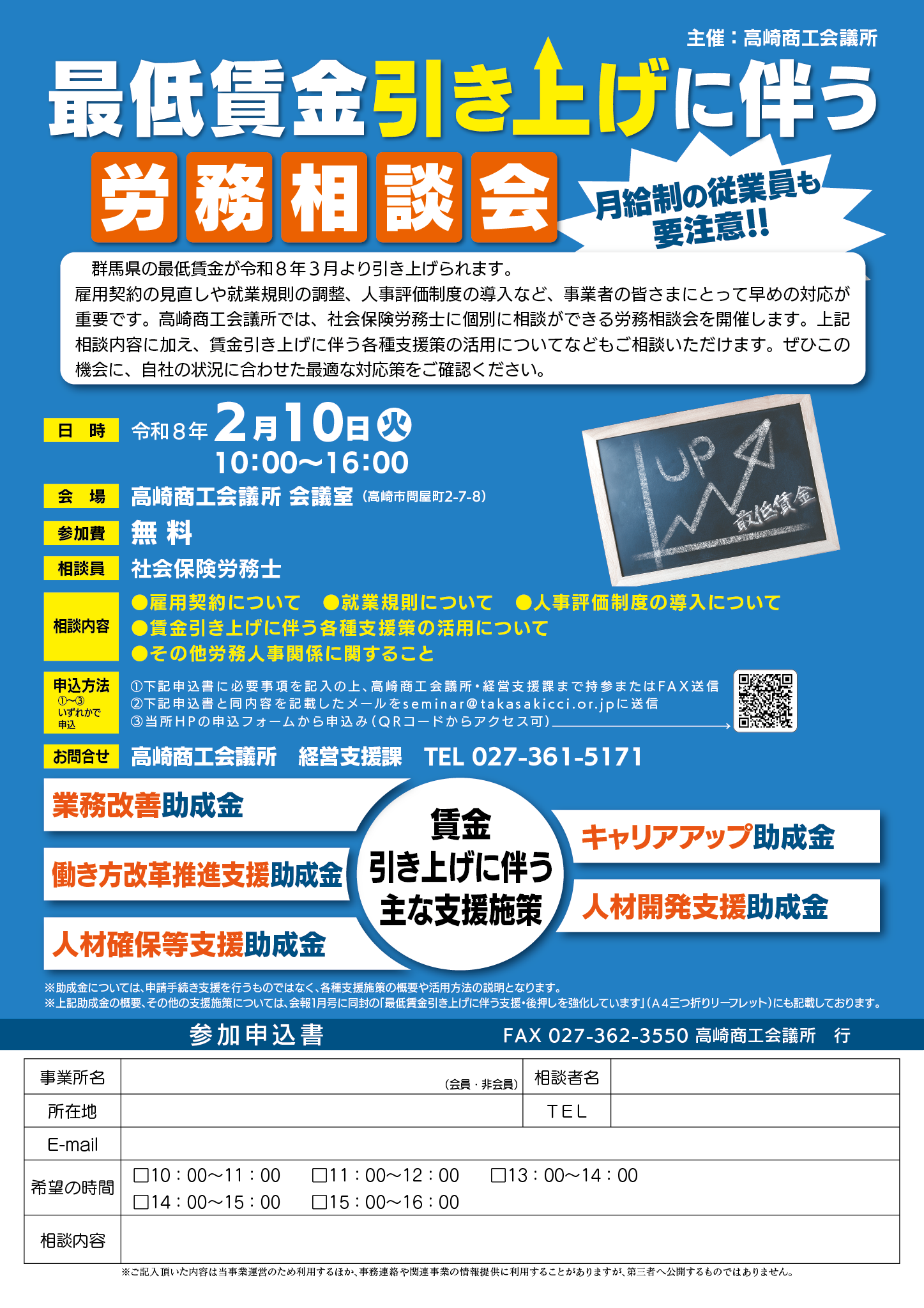 群馬県の最低賃金が令和8年3月に引き上げられます。雇用契約の見直しや就業規則の調整、人事評価制度の導入など、事業者の皆さまにとって早めの対応が重要です。当所では、社会保険労務士に個別に相談ができる労務相談会を開催します。賃金引き上げに伴う各種支援策の活用についてもご相談いただけます。ぜひこの機会に、自社の状況に合わせた最適な対応策をご確認ください。