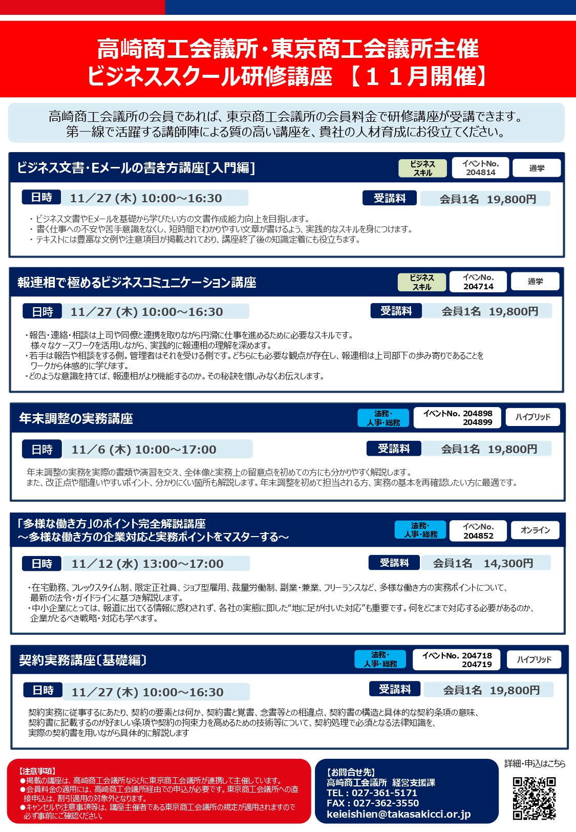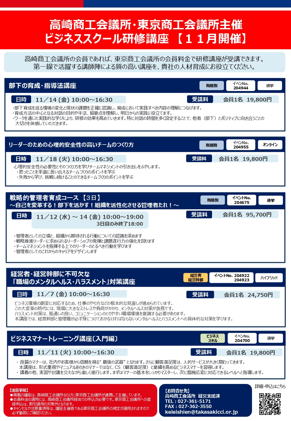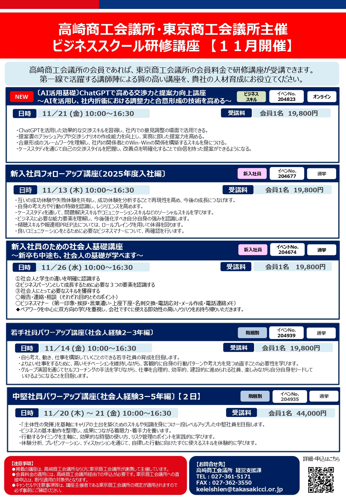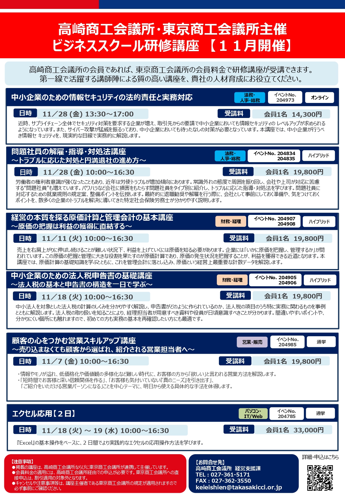 高崎商工会議所では、東京商工会議所と連携しており、高崎商工会議所会員の皆様も同研修講座を会員価格で受講いただくことができます。