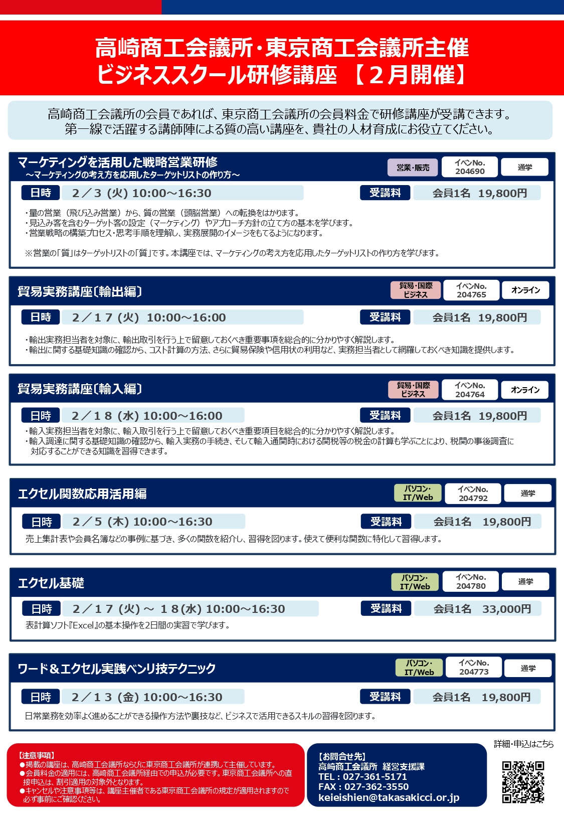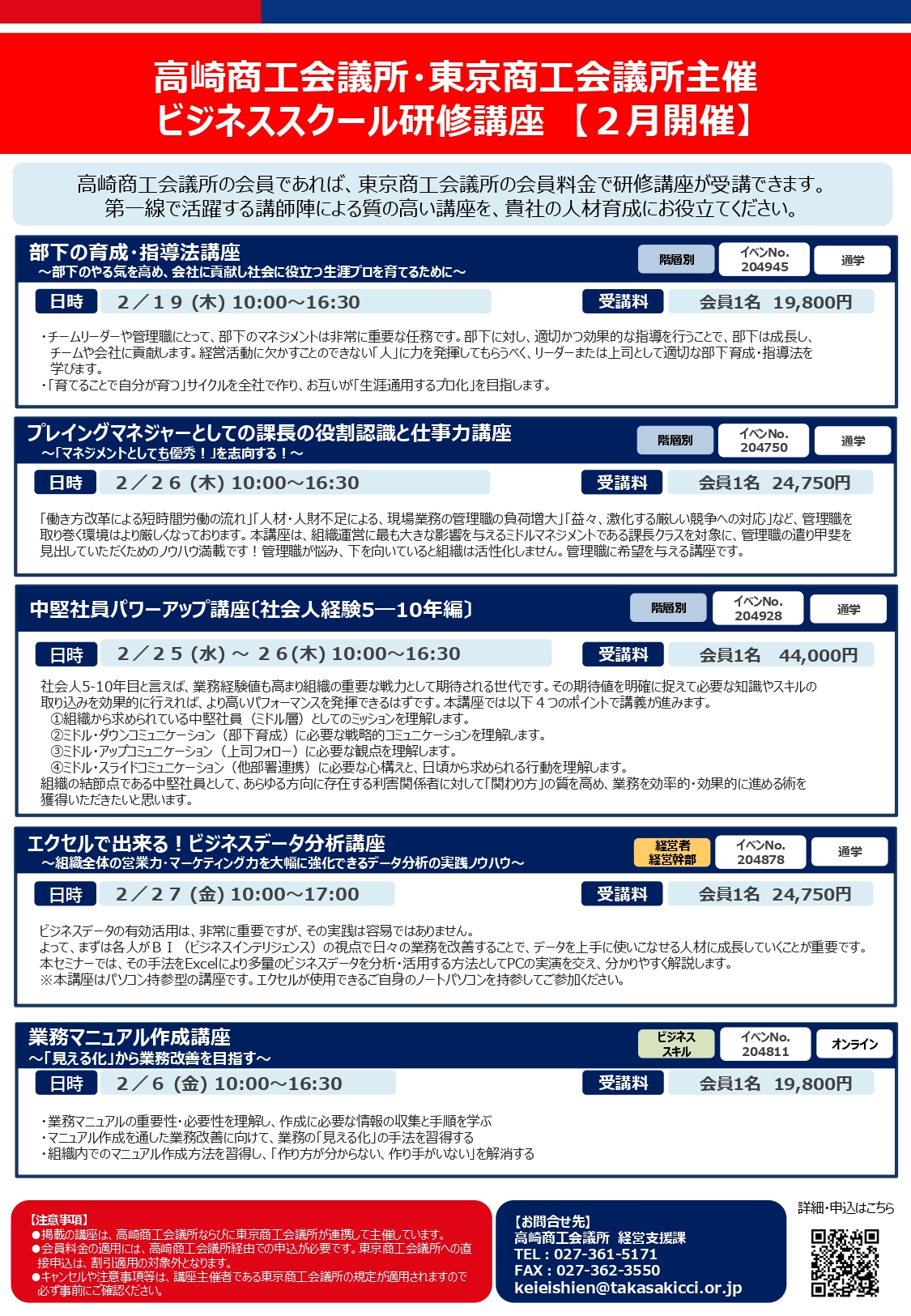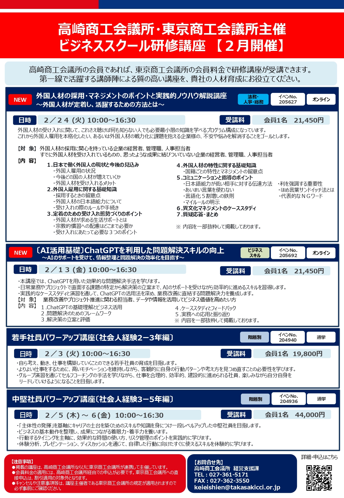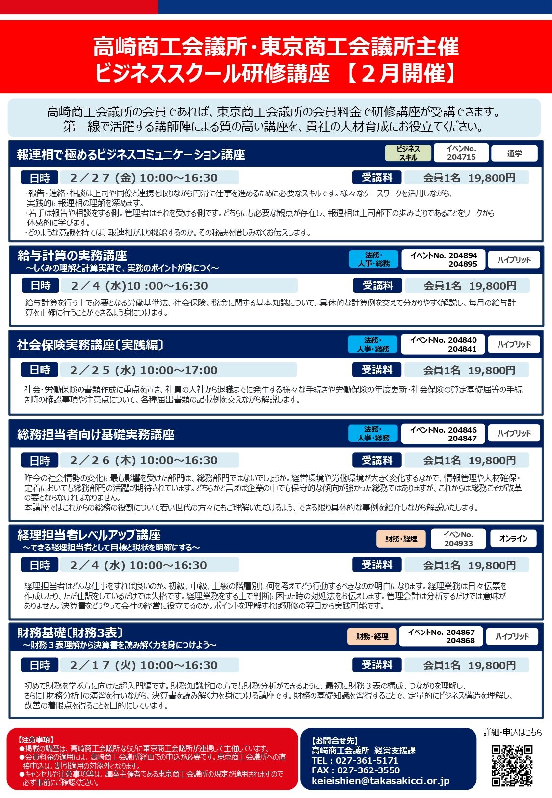 高崎商工会議所では、東京商工会議所と連携しており、高崎商工会議所会員の皆様も同研修講座を会員価格で受講いただくことができます。