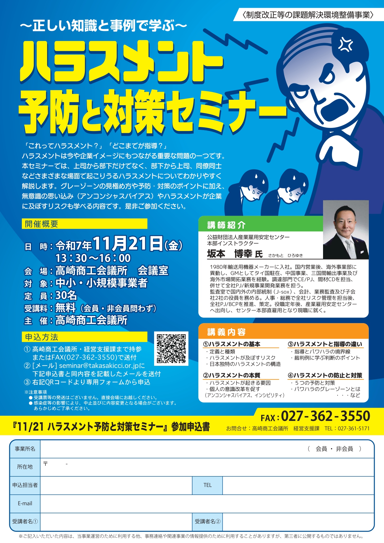 ハラスメントは今や企業イメージにもつながる重要な問題の一つです。本セミナーでは、上司から部下だけでなく、部下から上司、同僚同士などさまざまな場面で起こりうるハラスメントについてわかりやすく解説します。グレーゾーンの見極め方や予防・対策のポイントに加え、無意識の思い込み(アンコンシャスバイアス)やハラスメントが企業に及ぼすリスクも学べる内容です。是非ご参加ください。
